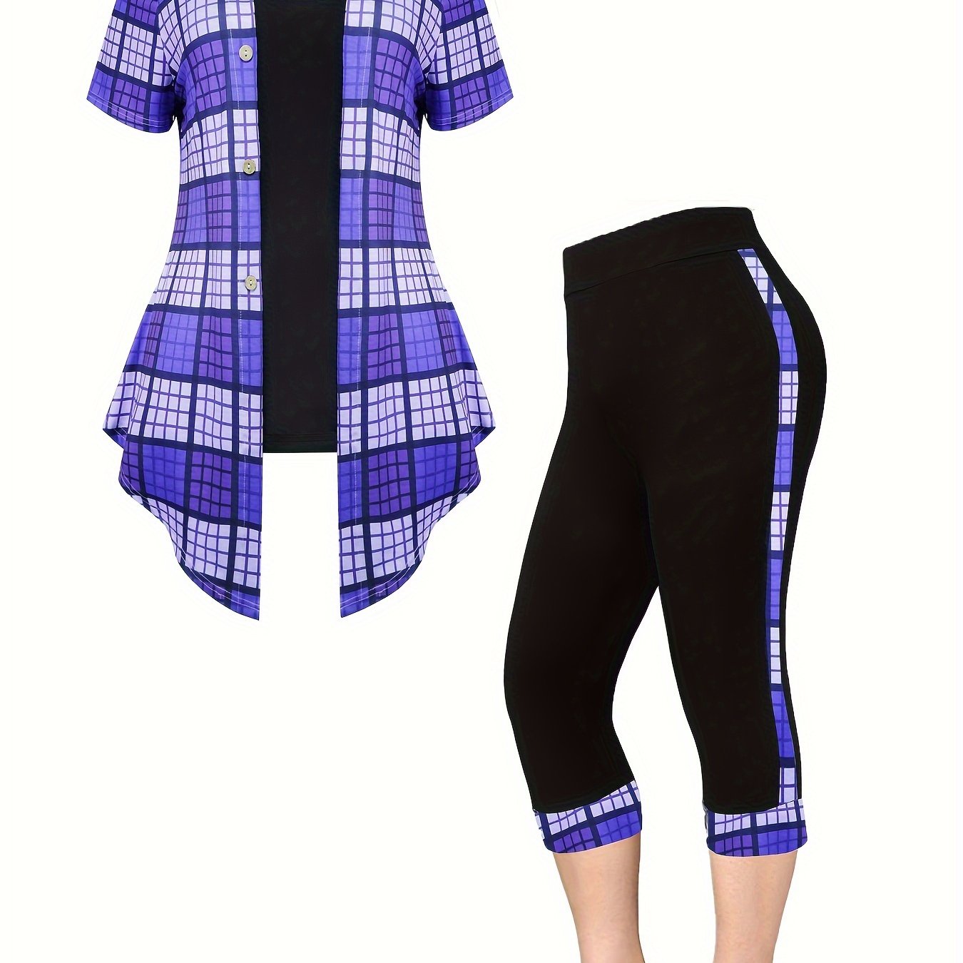 This Plus Size Two-Piece Set includes a V-neck top and capri pants, featuring a chic plaid print and a keyhole collar. Made with a soft polyester-elastane blend, the set is comfortable, stretchy, and perfect for casual wear. Machine washable for easy care and a flattering fit.