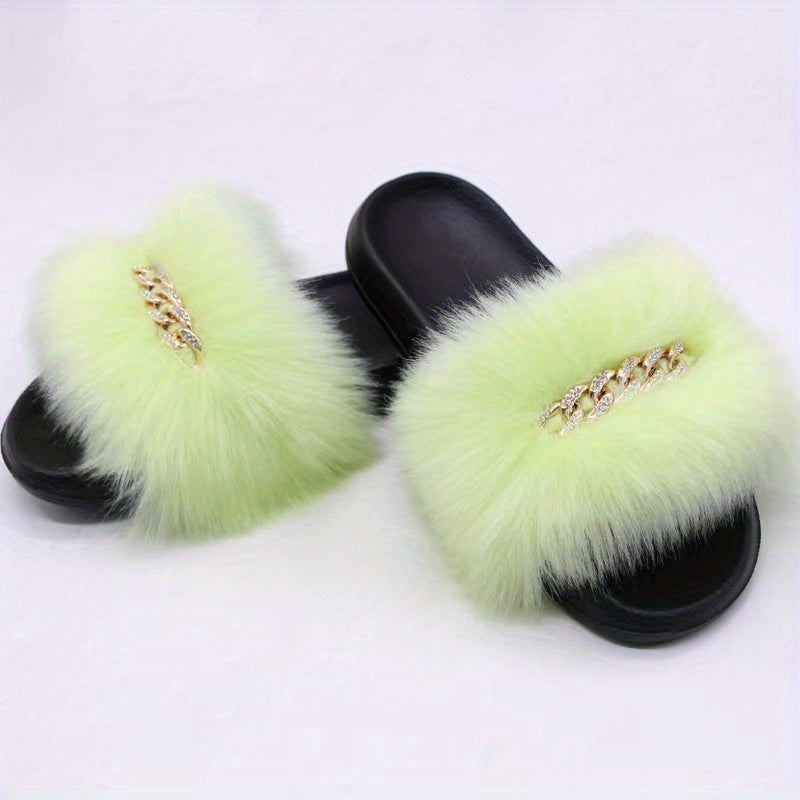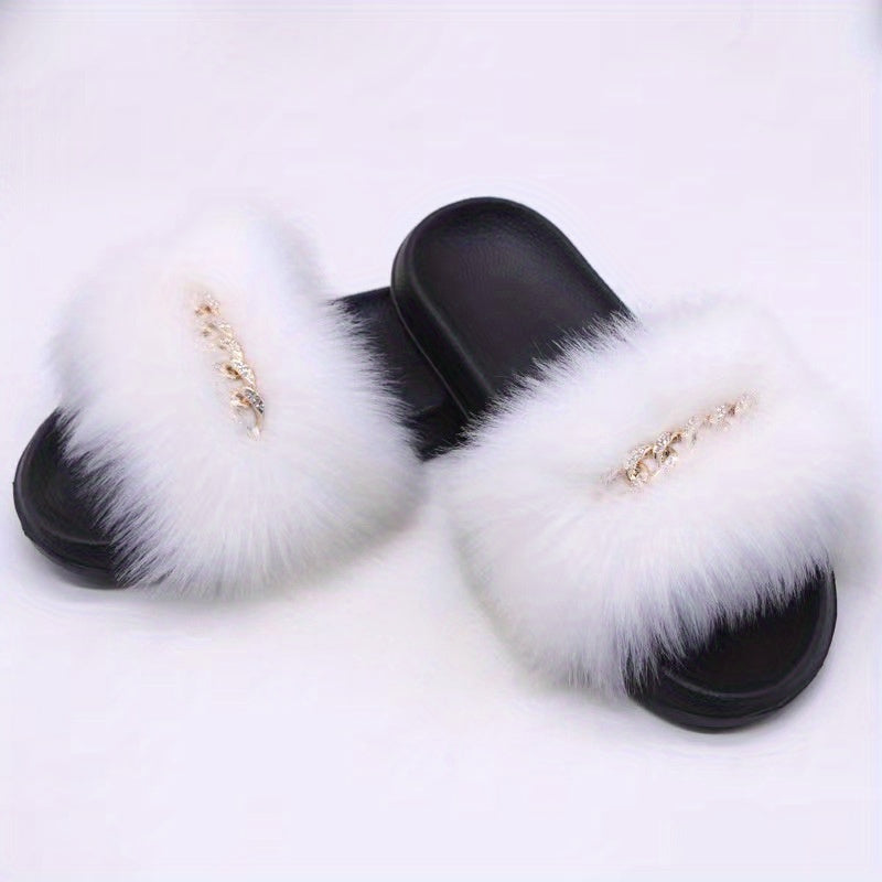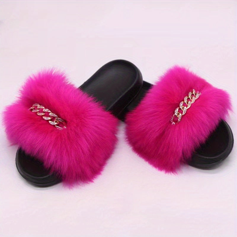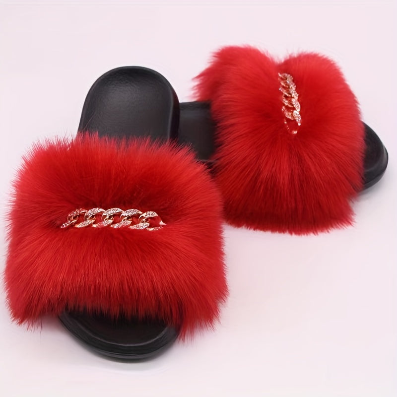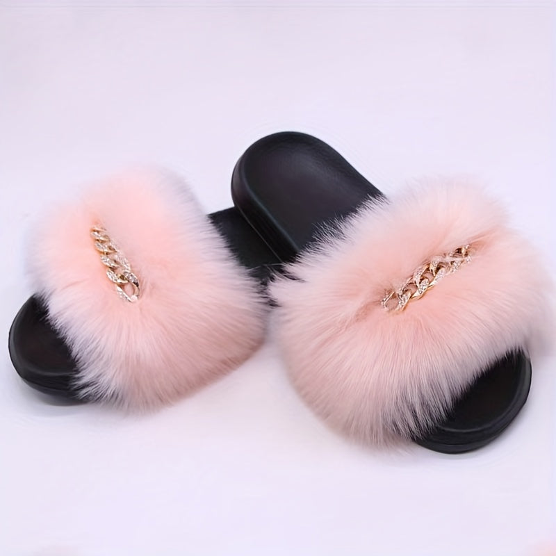 Women's Furry Flat Slippers - Chain Decor Open Toe Shoes