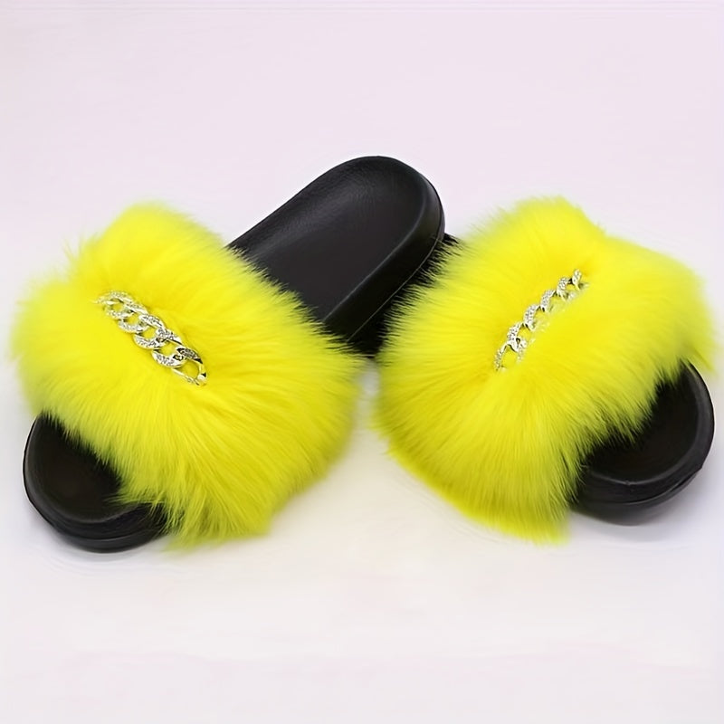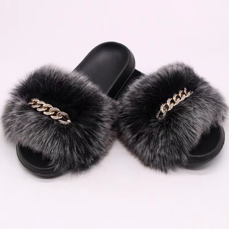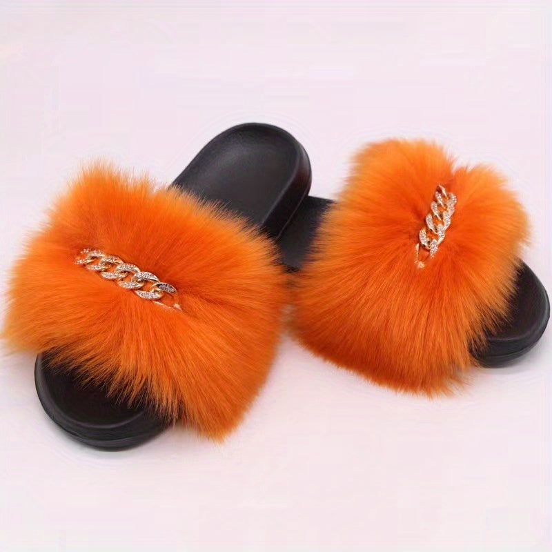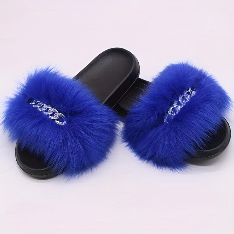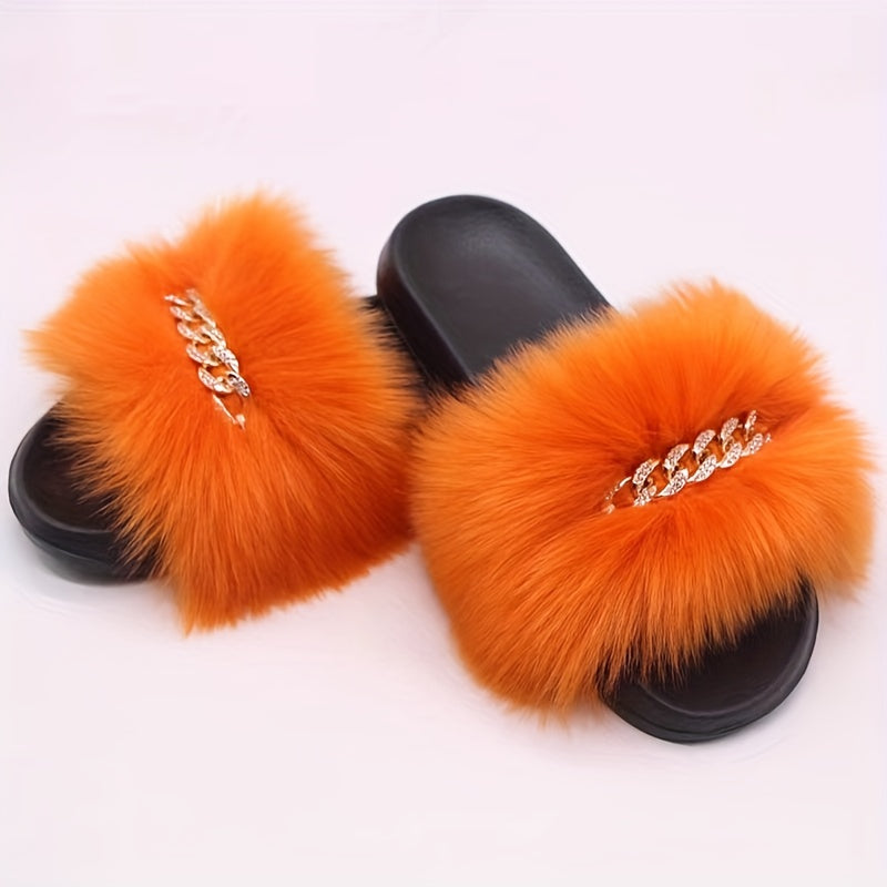 Women's Furry Flat Slippers - Chain Decor Open Toe Shoes