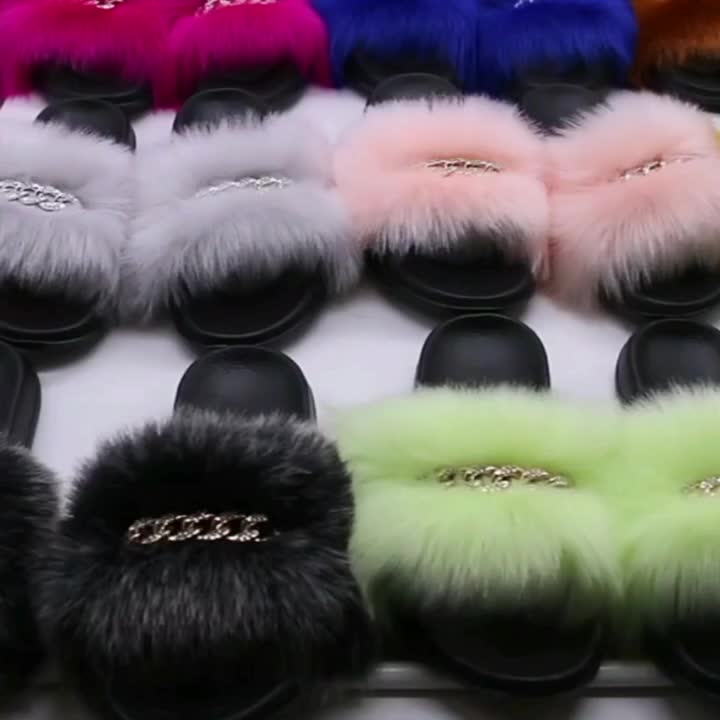 These Women's Fluffy Furry Flat Slippers combine comfort and style with a slip-on design, ankle strap, and open-toe style. Made with EVA material, they offer a cushioned feel and a fashionable chain decor for indoor and outdoor wear. Perfect for all-season casual comfort.